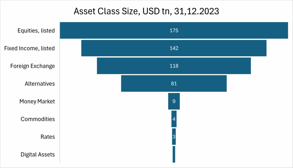 - As of 31.12.2023, equities were the largest asset class in the world at USD 175tn notional value.